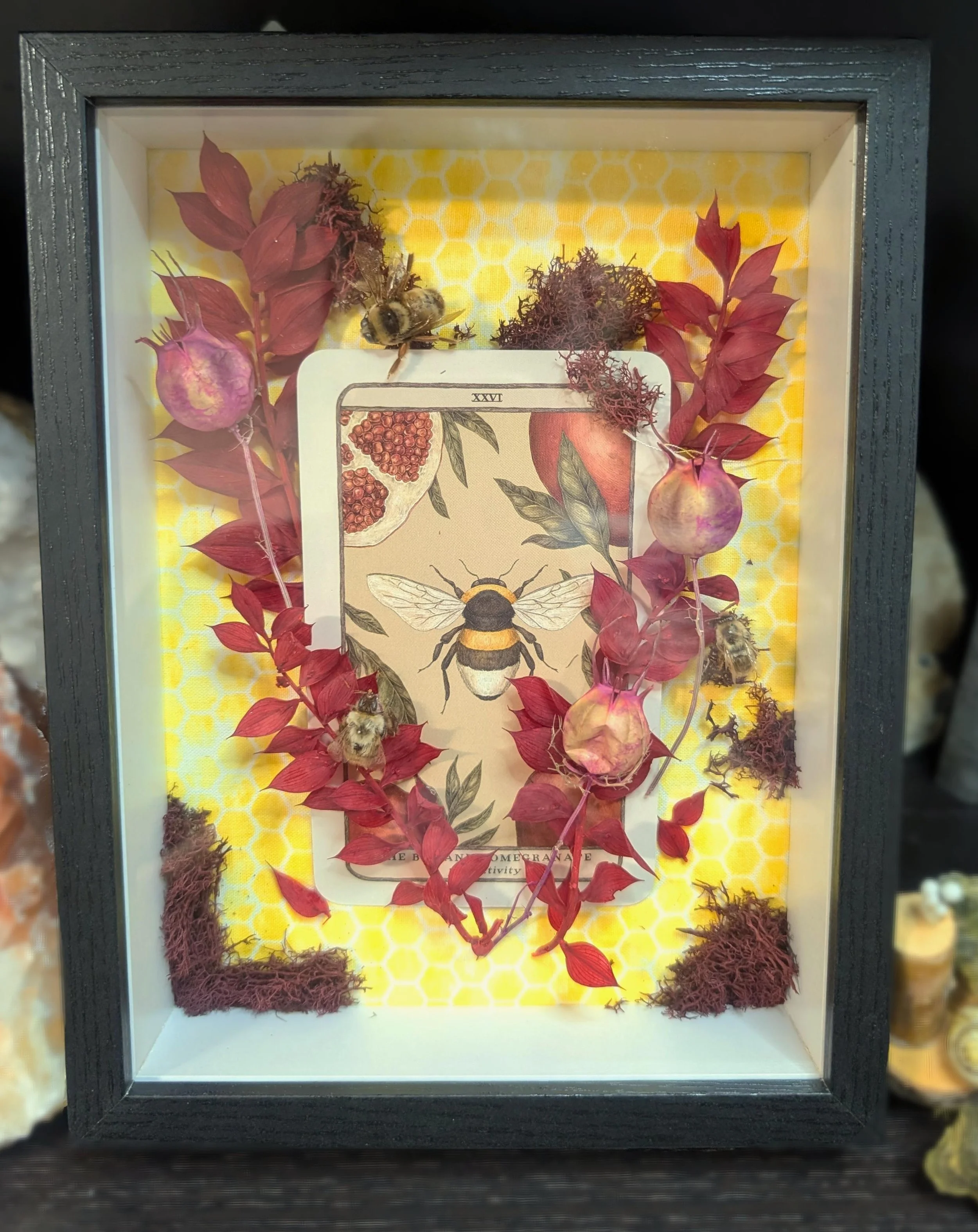 In a honeycomb glow, bees rest among crimson leaves and pomegranate skins; fragments of sweetness hard-won.